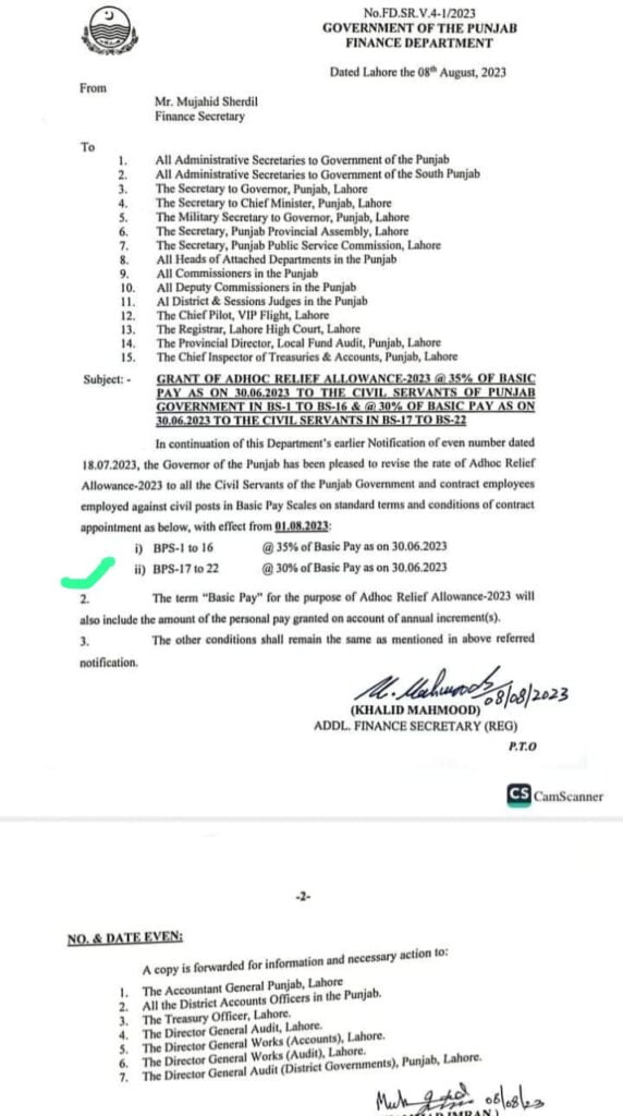 All employees of Bps-01 to bps-16 will get 35pc increments and bps 17 to bps 22 will get 30pc ad-hoc relief allowance from 1st August 2023.