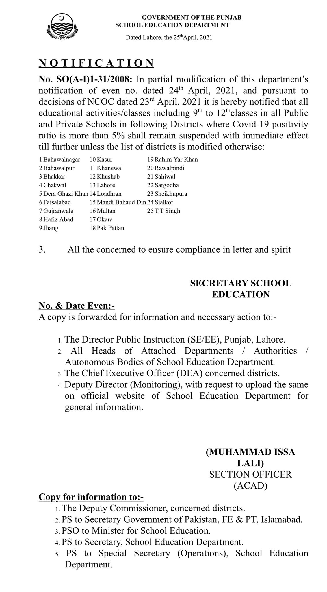 No. SO(A-I)1-31/2008: In partial modification of this department’s notification of even no. dated 24th April, 2021, and pursuant to decisions of NCOC dated 23rd April, 2021 it is hereby notified that all educational activities/classes Including 9th to 12thclasses in all Public and Private Schools in following Districts where Covid-19 positivity ratio is more than 5% shall remain suspended with immediate effect till further unless the list of districts is modified otherwise: